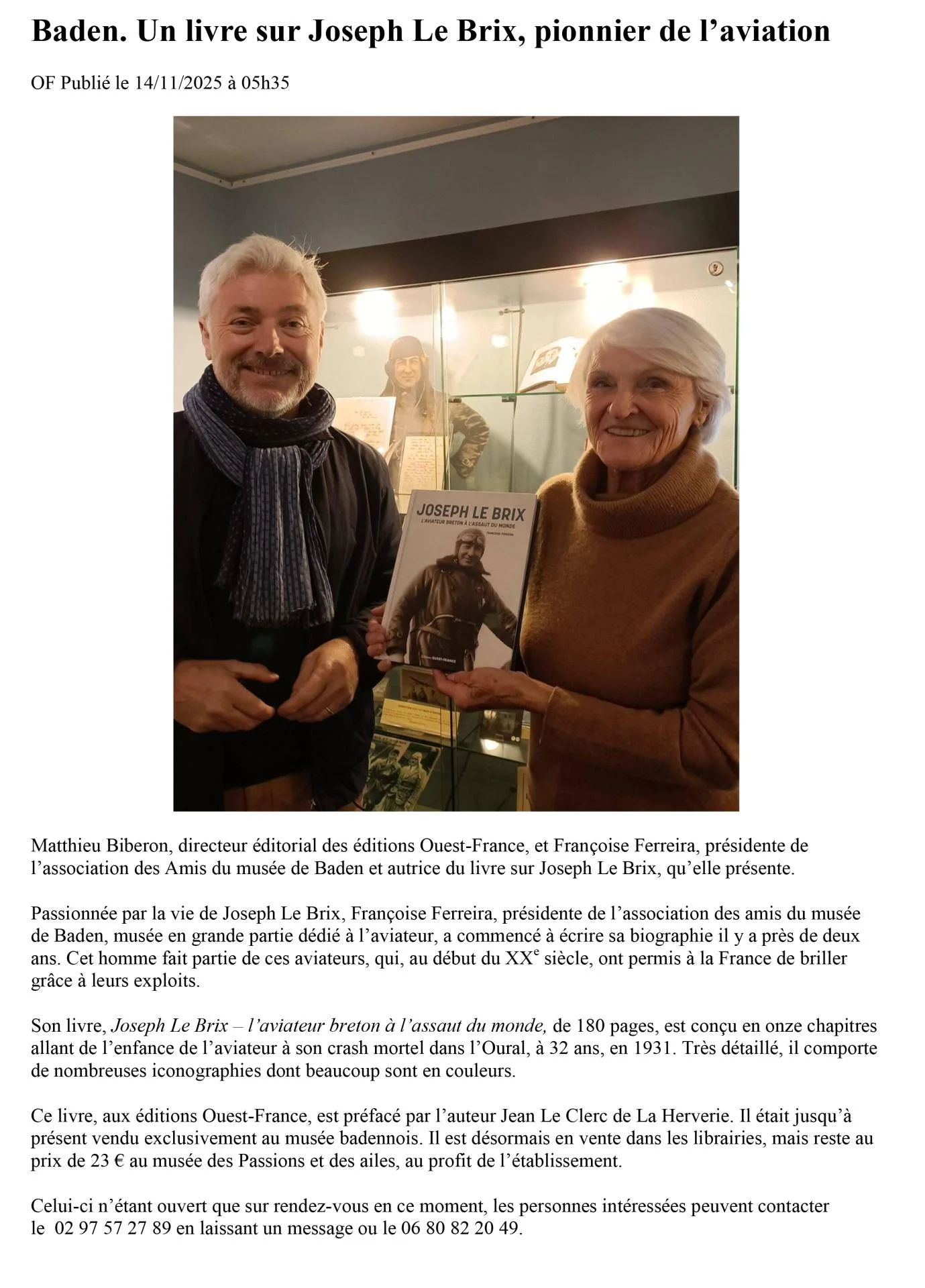 | 14 novembre 2025 | Un livre sur Joseph Le Brix, pionnier de l'aviation | Ouest-France |